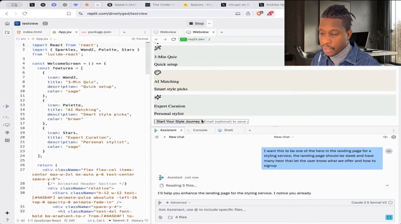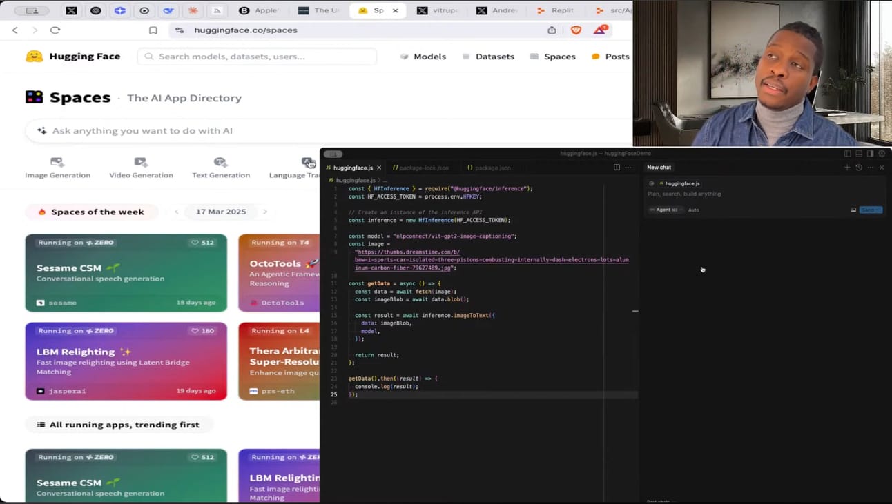 During the live stream, I demonstrated building a React app that uses Hugging Face's image classification API. Though we hit a few snags, the result was impressive—a functional grid of images with AI-generated descriptions, all built through conversational prompts.